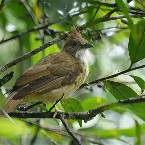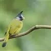 白喉冠鹎:体长20-25厘米。头顶红褐色,有长而细的羽冠、红褐色,头侧灰色。上体橄榄绿黄色,…