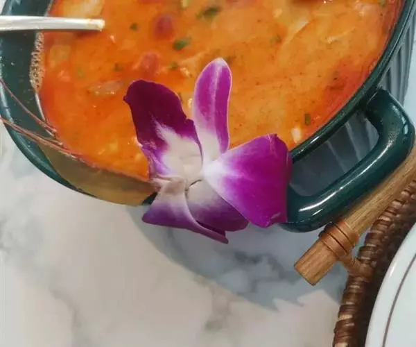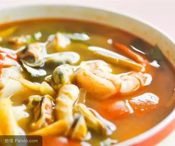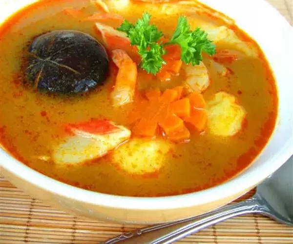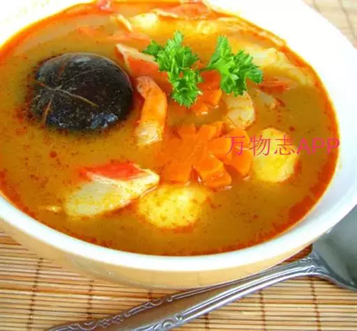 冬阴功汤 这道汤的名字中,“冬阴”是酸辣的意思,“功”是虾的意思,翻译过来其实就是酸辣虾汤。冬阴功汤极辣,其中还放有大量咖喱,但习惯了之后不少人倒是会贪恋上它。