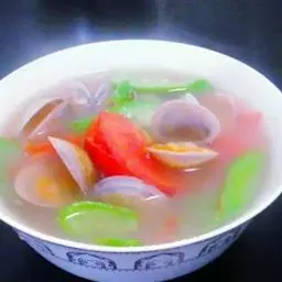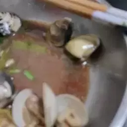 4.将剩下的汤烧开,放入焯好的草菇、虾、蛤蜊、切好的辣椒、冬阴功酱,调入少量鱼露、盐(可最后根据咸淡再加)、白糖、白胡椒粉,搅匀,去浮沫。