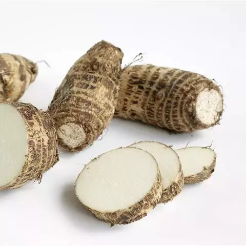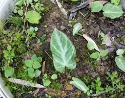 多年生草本。株高30厘米-40厘米,无茎或茎短小,具块茎或伸长的根茎,有时茎变厚而木质。叶基生,叶长椭圆状披针形,两端渐尖,叶脉明显,叶柄长,深绿色,基部呈鞘状,叶全缘或有分裂。