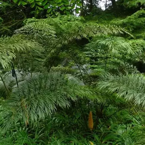 树干圆柱形,高可达60厘米,径达5厘米,基部光滑,暗赤色。叶呈叉状二回羽状深裂,雄球花圆柱形,小孢子叶近匙形或宽楔形,光滑,黄色,边缘橘黄色,种子成熟后变黄。