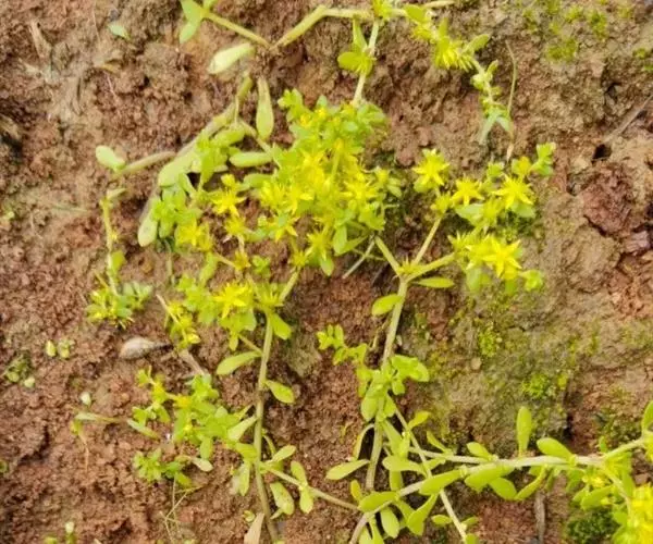 花序聚伞状,分枝3,常再二歧分枝;萼片5,披针形至倒披针形,长3-4毫米,宽达1毫米,有短距,先端钝;花瓣5,黄色,披针形,长4-5毫米,宽1.25毫米,先端有短尖;雄蕊10,长3毫米;心皮5,略叉开,基部1毫米合生,全长4毫米,连花柱长1毫米在内。花期4-5月。