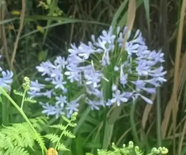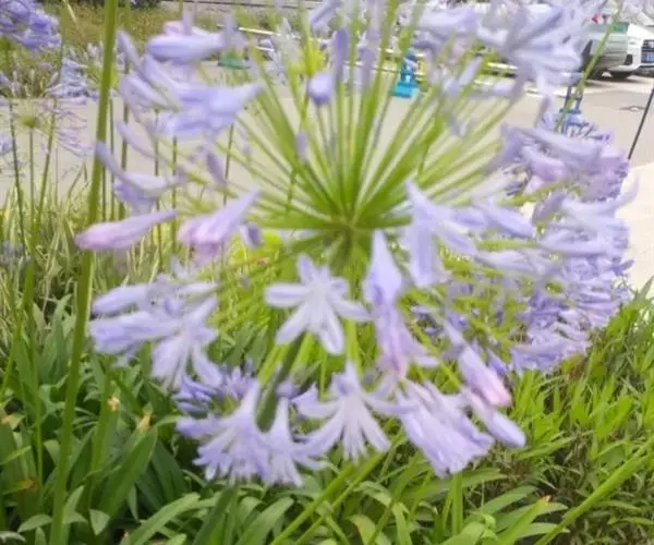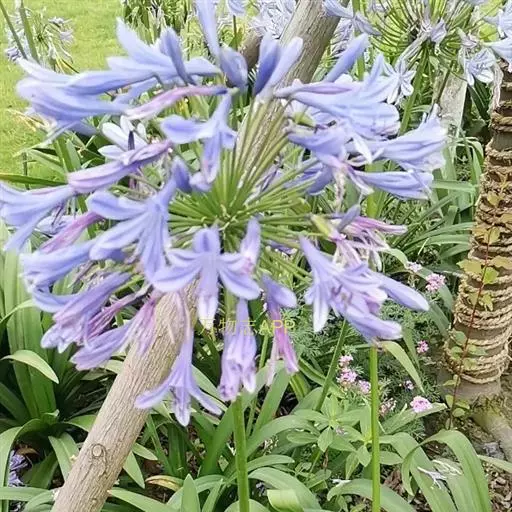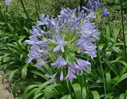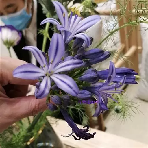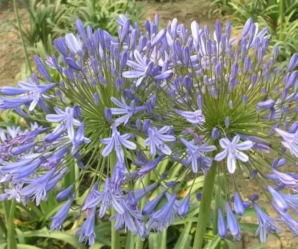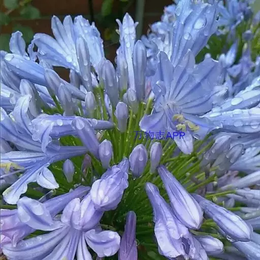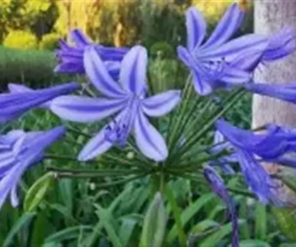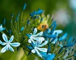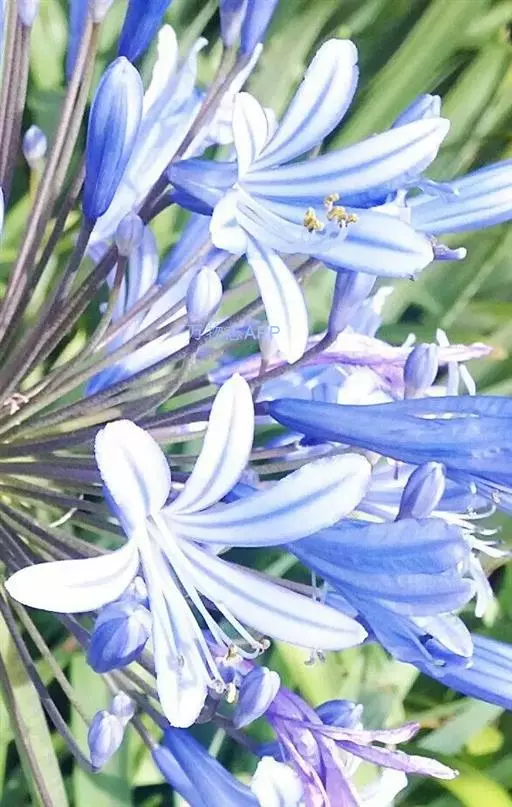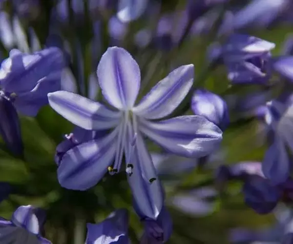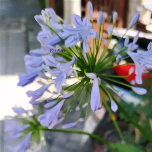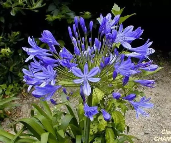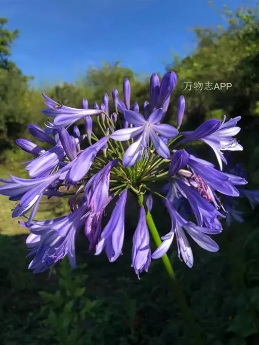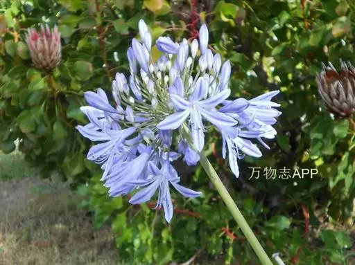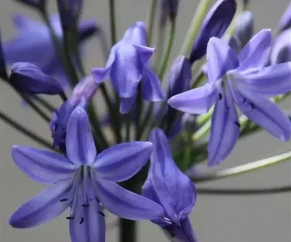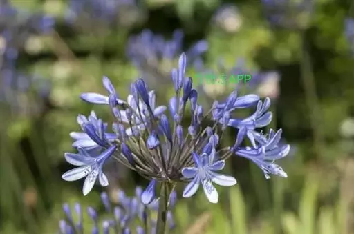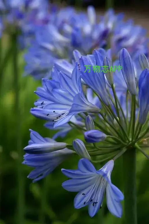百子莲属多年生宿根草本。线状披针形,花茎直立,高可达60厘米;伞形花序,有花10朵~50朵,花漏斗状,深蓝色或白色,花药最初为黄色,后变成黑色;花期7月~8月。