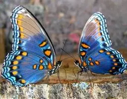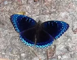 雌性明显较大。翅表深蓝色,有光泽。前翅外缘有 1 列小白点,亚外缘 线和外横线由相互套叠的“<”纹构成,中带的白纹上方长形,下方为点状,中室有蓝白纹;后翅外缘有 1 列白点,亚外缘有 1 列“<”形白纹,翅内侧还布有星点状蓝白点。翅里黑色,斑纹同翅表。浙江一年发生三代,以蛹越冬。