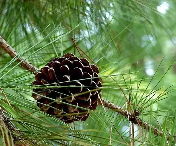 乔木,在原产地高达30米,胸径90厘米;树皮灰褐色或暗红褐色,纵裂成鳞状块片剥落;枝条每年生长3-4轮,春季生长的节间较长,夏秋生长的节间较短,小枝粗壮,橙褐色,后变为褐色至灰褐色,鳞叶上部披针形,淡褐色,边缘有睫毛,干枯后宿存数年不落,故小枝粗糙;冬芽圆柱形,上部渐窄,无树脂,芽鳞淡灰色。针叶2-3针一束并存,长18-25厘米,稀达30厘米,径约2毫米,刚硬,深绿色,有气孔线,边缘有锯齿;树脂道2-9(11)个,多内生;叶鞘长约1.2厘米。球果圆锥形或窄卵圆形,长6.5-13厘米,径3-5厘米,有梗,种鳞张开后径5-7厘米,成熟后至第二年夏季脱落;种鳞的鳞盾近斜方形,肥厚,有锐横脊,鳞脐瘤状,宽5-6毫米,先端急尖,长不及1毫米,直伸或微向上弯;种子卵圆形,微具3棱,长6毫米,黑色,有灰色斑点,种翅长0.8-3.3厘米,易脱落。