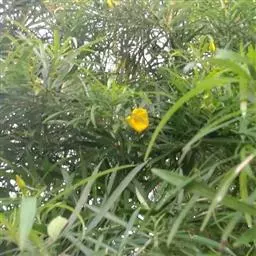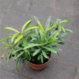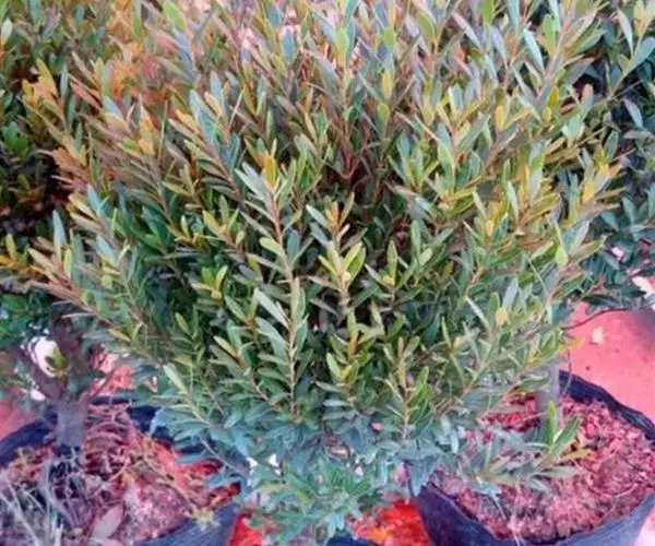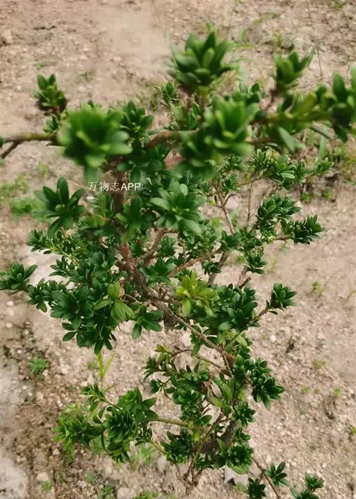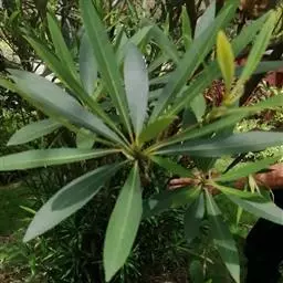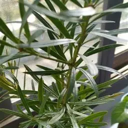 叶常密生枝条的上部,叶间距离极短,革质或薄革质,斜展,窄椭圆形、窄矩圆形或披针状椭圆形,长 1.5~4 公分,宽 0.3~0.8 公分(幼树或萌芽枝的叶长达 5.5 公分,宽 1.1 公分,先端钝,有突起的小尖头),上面绿色,有光泽,中脉隆起,下面色淡,干后淡褐色,中脉微隆起,伸至叶尖,边缘微向下卷曲,先端微尖或钝,基部健窄,叶柄极短,长 0.15~0.4 公分。