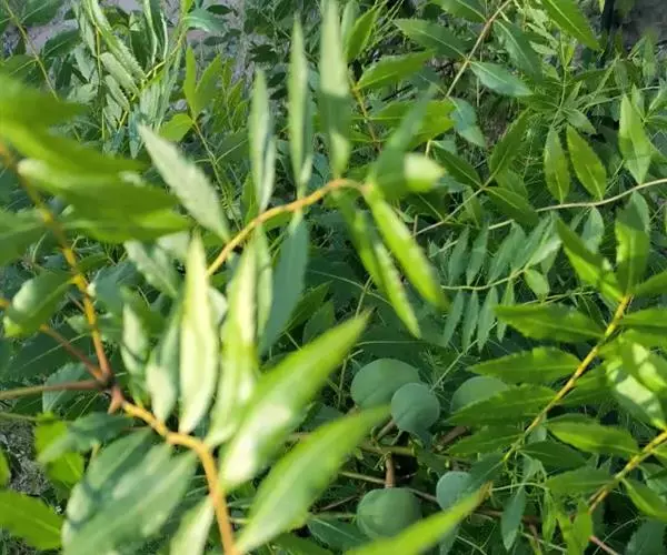 叶连柄长15-30厘米;小叶4-8对,膜质或纸质,披针形或近卵形,两侧稍不对称,长2.5-6厘米,宽1.2-2厘米,顶端渐尖,基部楔形,边缘有锐利锯齿,顶生小叶通常3深裂,腹面深绿色,无毛或中脉上有疏毛,背面鲜绿色,嫩时被绒毛和成束的星状毛;侧脉纤细,两面略凸起。