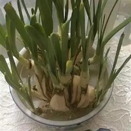 催芽:浸好的鳞茎球需放在阳光下曝晒,最好放入容器内,覆盖一层砻糠。每天浇水一次,使砻糠保持温度和湿度。这时要注意防寒和光照过强,可以适当遮盖。一周后新芽萌出,便可充分照射阳光。50天左右,花头窜出,即可取出水仙球冲洗干净,移栽于水盆中养植。