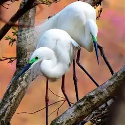雪鹭:全身洁白的羽毛,颈背有丝状蓑羽。有一双亭亭玉立黄色长腿和一个黑色的鸟喙。在繁殖季节,鼻孔和眼…