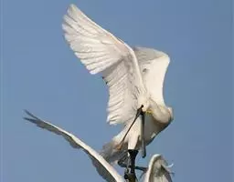 琵鹭 琵鹭常成群活动。偶尔亦见有单只活动的。休息时常在水边成一字形散开。长时间站立不动,受惊后则飞往他处。性机警畏人,飞翔时两翅鼓动较快,平均每分钟鼓动达186次左右。飞翔时常排成稀疏的单行,或成波浪式的斜列飞行。既能鼓翼飞翔,也能利用热气流进行滑翔,而且常常是鼓翼和滑翔结合进行,在一阵鼓翼飞翔之后接着是滑翔。飞行时两脚伸向后方,头颈向前伸直。