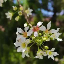 圆锥花序顶生或生于侧枝顶,长6-25厘米,被贴生柔毛,花序轴常为“之”字形屈曲;苞片1个,线状披针形,长4-6毫米,被柔毛;小苞片线形,长1-2毫米;花多数,直径6-8毫米;萼片5个,离生,宿存,广卵形,大小不相等,长4-5毫米,先端钝,无毛或偶有疏毛,边缘有睫毛;花瓣通常3个,白色,卵圆形,约与萼片等长;雄蕊多数,比萼片稍短,花丝线形,干后黑色,花药“八”字形排在膨大药隔上,干后灰色;心皮1个,无毛,花柱突出雄蕊之外。