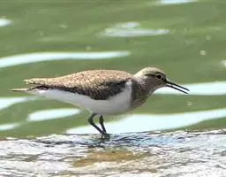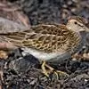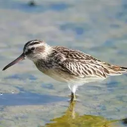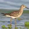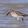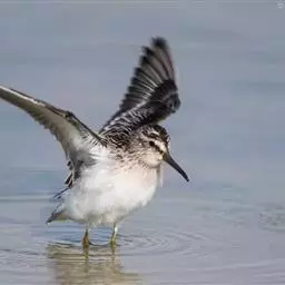 阔嘴鹬是涉禽,体长17厘米。特征为翼角常具明显的黑色块斑并具双眉纹。与黑腹滨鹬平滑下弯的嘴相比,…