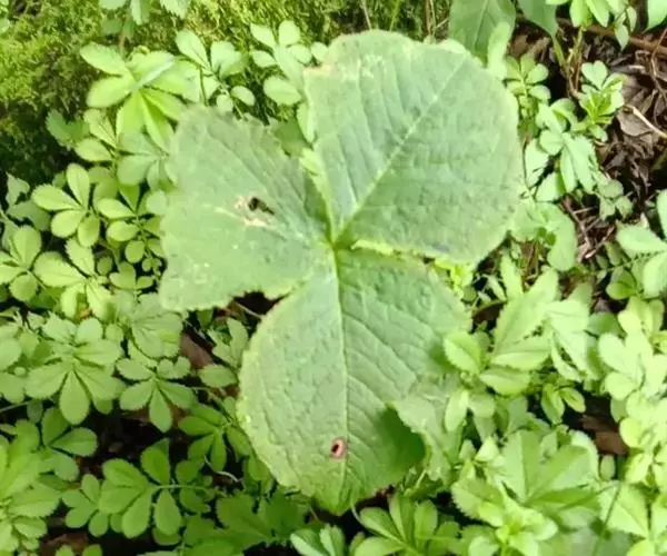 块茎近球形,直径3-5厘米,密生长达10余厘米的纤维状须根。鳞叶3-4,内面2片狭长三角形,长9-15厘米,基部展开宽可达5厘米,绿色或紫色。叶1,叶柄长20-30厘米,黄绿色,基部粗可达2厘米,无鞘,光滑或多少具疣状突起;叶片3全裂,稀3深裂,裂片具0.5-1厘米的柄或无柄,稀基部联合,干时二面黄绿色,中肋背面明显隆起,侧脉斜伸,向边缘远离,脉距1-2厘米,集合脉距边缘0.5-1.5厘米,网脉明显;中裂片倒心形,顶部平截,中央下凹,具正三角形的尖头,向基部渐狭,宽远胜于长,长(5-)9-9.5厘米(包括5-10毫米长的尖头),宽(6-)10.5-12.5厘米;侧裂片较大,长6.5-13厘米。宽(5.5-)11-13厘米,宽斜卵形,骤狭短渐尖,外侧宽,基部圆形,内侧楔形或圆形。