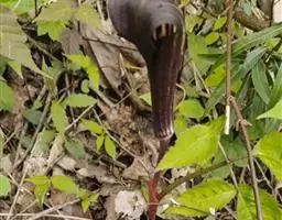 花序柄短于叶柄,长9-25厘米,粗3-5毫米,绿色或淡紫色,具细疣状凸起或否。佛焰苞青紫色,基部黄绿色,管部具白色条纹,向上隐失,上部全为深紫色,管部圆柱形,长2.4-6.5厘米,粗1.8-2.6厘米,喉部边缘斜截形,两侧下缘相交成直角;檐部长圆披针形,长4.5-10厘米,宽3-3.5厘米,由基部稍内弯,先端骤狭渐尖。肉穗花序单性,雄花序长1.5-3厘米,花序轴粗可达8毫米,连花粗1.5厘米,花疏,附属器基部略细成柄状,或几无柄,中部以上渐细,最后成线形,从佛焰苞喉部附近下弯,然后之字形上升或弯转360度后上升或蜿蜒下垂;雌花序长1-2.5厘米,下部粗1.2厘米,附属器基部骤然扩大至5-7毫米,具长5-10毫米的柄,余同雄序附属器。雄花具长柄,柄长2.2-2.5毫米,花药2-5,药室顶部滆合,马蹄形开裂;雌花:子房长卵圆形,先端渐狭为短的花柱,柱头盘状,密被短绒毛,1室,胚珠多数(6-10)。