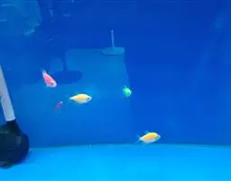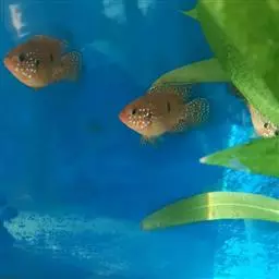繁殖用亲鱼雌鱼选择体色艳丽、腹部膨大的个体,雄鱼选择体长在8 红宝石鱼 厘米以上的个体。先将10对亲鱼放入两个大缸内,让其自行配对,最终配成5对,然后将每对各放入一个繁殖用鱼缸,每天投喂人工配合饲料。