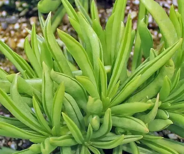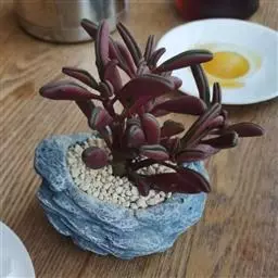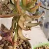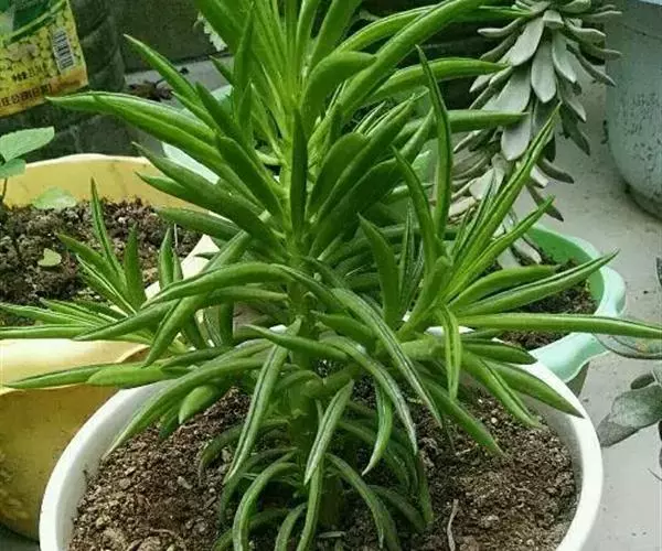 茎秆粗壮,叶顶端轮生,长5-6厘米、宽1.7厘米、厚0.6厘米,先端尖、基部棒糙形,一侧中间圆弧形突出,另一侧平直,弧形一侧的边缘较薄,有透明的条纹,平直的一侧边缘厚,整个叶就像一把斧子。带粉的灰绿色。花序很长,花黄绿色。叶片肉质,株形小巧丰满,适合半阴环境,是理想的桌面小盆栽。