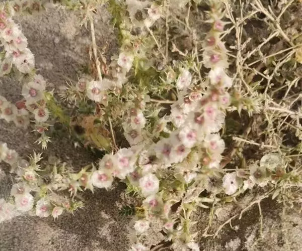 性状鉴别 全草黄白色。茎有棱,具短硬毛。叶片圆柱形,先端成尖刺状,基部扩大,边缘膜质。枝上部为穗状花序;苞片、小苞片顶部都成尖刺状。花被片硬,自背面中部生5翅,3个较大,2个较窄,向中央聚集,包干果实外,直径7- 10mm。种子直径约2mm。