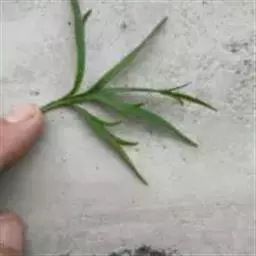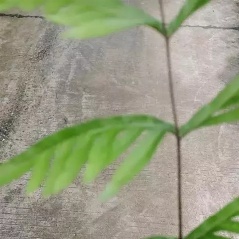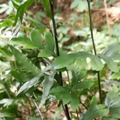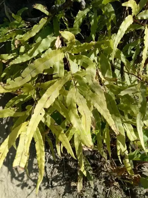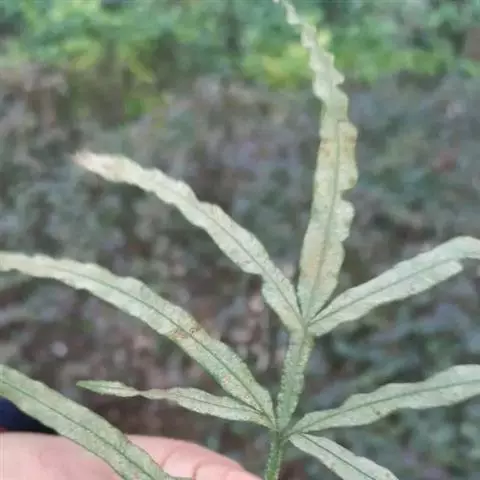 叶边仅有矮小锯齿,顶生三叉羽片的基部常下延于叶轴,其下一对也多少下延。叶簇生,二型或近二型;柄长30-45厘米(不育叶的柄较短),基部粗约2毫米,禾秆色,有时带棕色,偶为栗色,表面平滑;叶片卵圆形,长25-30厘米,宽15-20厘米,一回羽状;不育叶的羽片(2)3-5对(有时为掌状),通常对生,斜向上,基部一对有短柄并为二叉(罕有三叉),向上的无柄,狭披针形或披针形(第二对也往往二叉),长10-18(24)厘米,宽1-1.5(2)厘米,先端渐尖,基部阔楔形,叶缘有软骨质的边并有锯齿,锯齿往往粗而尖,也有时具细锯齿;能育叶的羽片3-5(8)对,对生或向上渐为互生,斜向上,基部一对有短柄并为二叉,偶有三叉或单一,向上的无柄,线形(或第二对也往往二叉),长12-25厘米,宽5-12毫米,先端渐尖并有锐锯齿,基部阔楔形,顶生三叉羽片的基部不下延或下延。主脉下面强度隆起,禾秆色,光滑;侧脉两面均明显,稀疏,斜展,单一或从基部分叉。叶干后纸质,绿色或灰绿色,无毛;叶轴禾秆色,表面平滑。