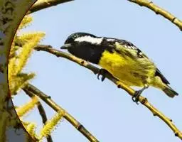 黄腹山雀是雀形目山雀科山雀属鸟类。虹膜褐色或暗褐色;嘴蓝黑色或灰蓝黑色;头、喉胸斑黑色,…