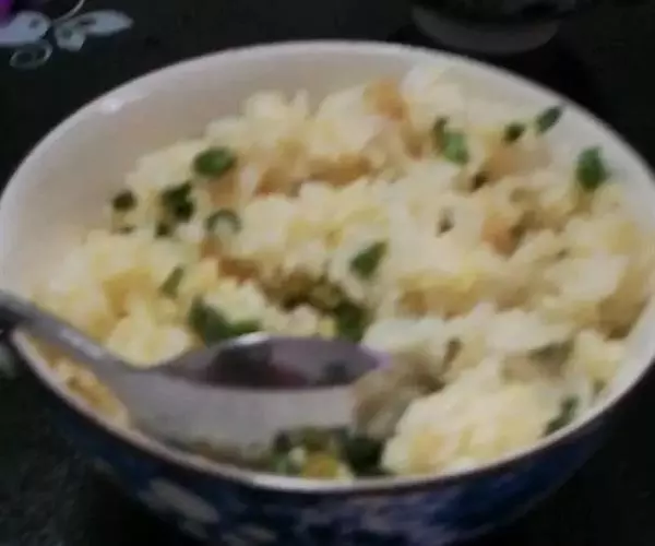1、用油起锅,将鸡蛋放在锅中,加入精盐、味精、白饭炒透;