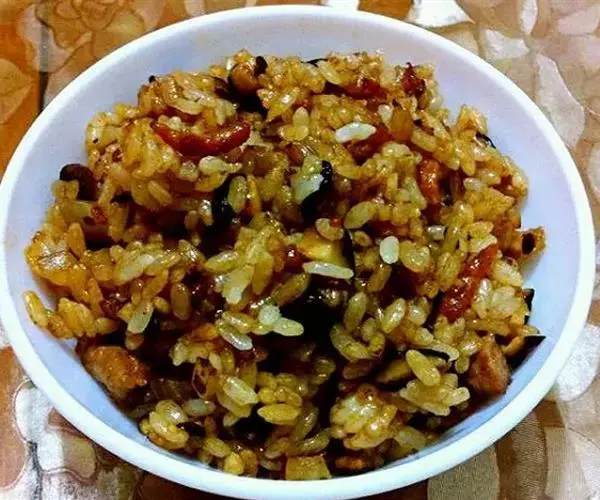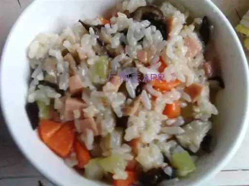 主料:米饭(蒸)(100克) 香菇(鲜)(30克) 洋葱(30克) 青豆(100克) 金华火腿(50克) 鸡蛋(70克) 猪肉(瘦)(100克)