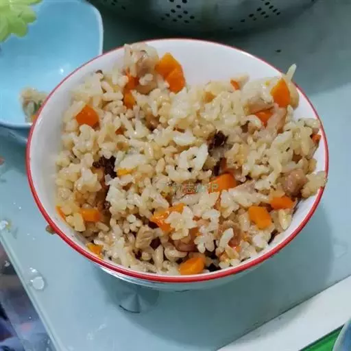 3、再放入少许色拉油加热至八成,将米饭放入锅内翻炒。此时,需将饭中加放少许食盐和鸡精(鸡精不宜放太多,否则太鲜也不好吃)。当米饭炒到在锅里可以蹦起饭粒时,再将刚才炒好的主料及辅料全部返锅炒拌,直到饭粒松软不粘为起锅最佳时间。