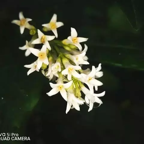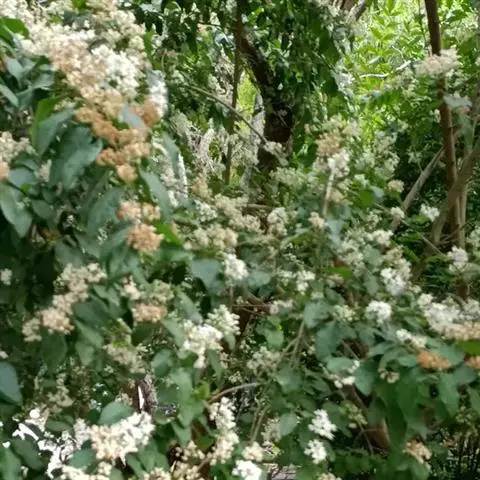 大型常绿灌木,高3-5米,无毛。小枝灰褐色或淡灰色,圆 柱形,疏生圆形或长圆形皮孔,幼枝圆柱形,稍具棱,节处稍压扁。叶片厚革质,椭圆形或宽卵状椭圆形,稀卵形,长5-8(-10)厘米,宽2.5-5厘米,先端锐尖或渐尖,基部楔形、宽楔形至圆形,叶缘平或微反卷,上面深绿色,光亮,下面黄绿色,具不明显腺点,两面无毛,中脉在上面凹入,下面凸起,呈红褐色,侧脉4-7对,两面凸起;叶柄长0.5-1.3厘米,上面具深而窄的沟,无毛。圆锥花序塔形,无毛,长5-17厘米,宽几与长相等或略短;花序轴和分枝轴具棱,第二级分枝长达9厘米;花梗极短,长不超过2毫米;小苞片披针形,长1.5-10毫米;花萼长1.5-1.8毫米,先端近截形或具不规则齿裂;花冠长5-6毫米,花冠管长3-3.5毫米,裂片与花冠管近等长或稍短,长2.5-3毫米,先端稍内折,盔状;雄蕊伸出花冠管外,花丝几与花冠裂片等长,花药长圆形,长1.5-2毫米;花柱长3-5毫米,稍伸出于花冠管外,柱头棒状,先端浅2裂。果长圆形或椭圆形,长8-10毫米,宽6-7毫米,直立,呈紫黑色,外被白粉。花期6月,果期11月。
