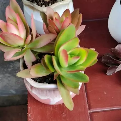 叶片为圆弧状,一般四角对生,呈叠加状态,喜欢温暖、干燥,阳光充足的环境,加强日照时叶片会呈淡粉色,叶面多白色小点,花类似神刀,由无数小红花锦簇而成。