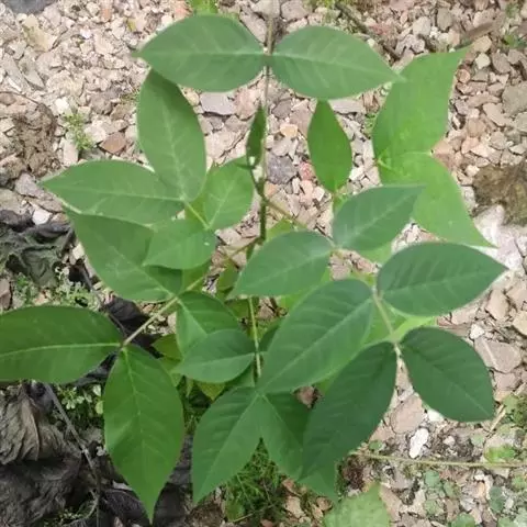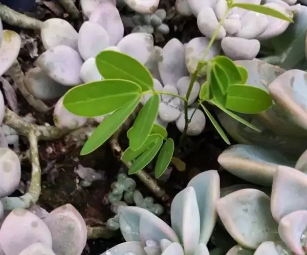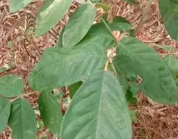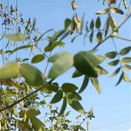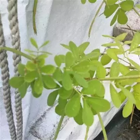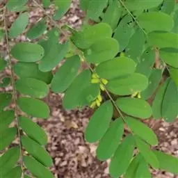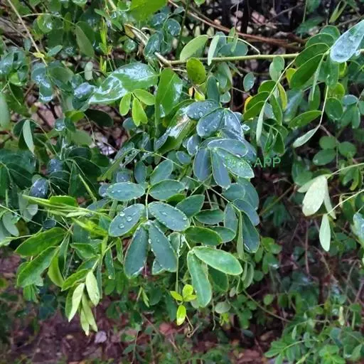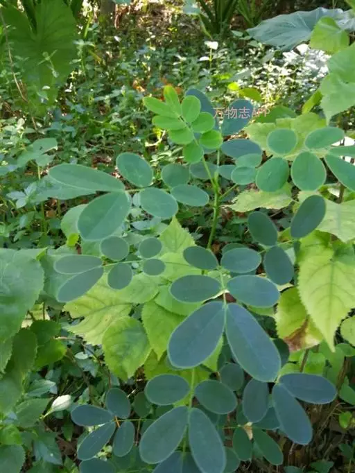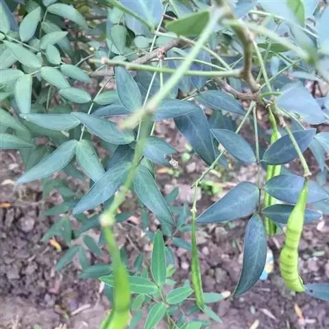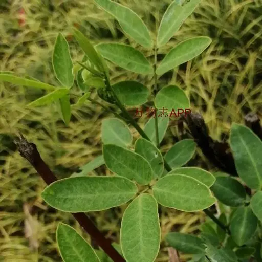 叶长7-12厘米,有小叶3-4对;叶柄长2.5-4厘米;小叶倒卵形或倒卵状长圆形,膜质,长2.5-3.5厘米,宽约1.5厘米,顶端圆钝,基部渐狭,偏斜,下面粉绿色,侧脉纤细,在近边缘处呈网结;在最下方的一对小叶间有黑褐色线形而钝头的腺体1枚。