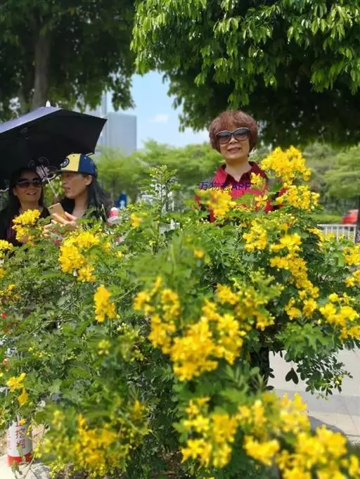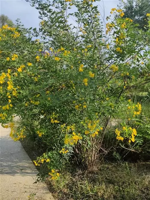 双荚决明 金秋时节,在华南植物园不起眼的角落,会看到一团团正在盛花期的灌木在阳光的映照下显得格外艳丽夺目,走近看翠绿的灌木丛顶上点缀着一簇簇鲜黄色的花朵,给人以愉悦、亮丽、壮观之美,它就是双荚决明。它的荚果常2个一组,悬挂于枝顶,故名双荚决明。