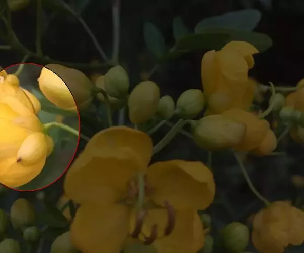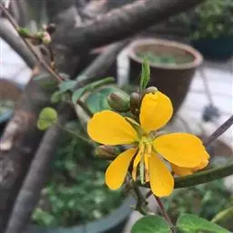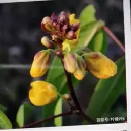 总状花序生于枝条顶端的叶腋间,常集成伞房花序状,长度约与叶相等,花鲜黄色,直径约2厘米;雄蕊10枚,7枚能育,3枚退化而无花药,能育雄蕊中有3枚特大,高出于花瓣,4枚较小,短于花瓣。