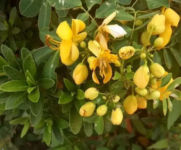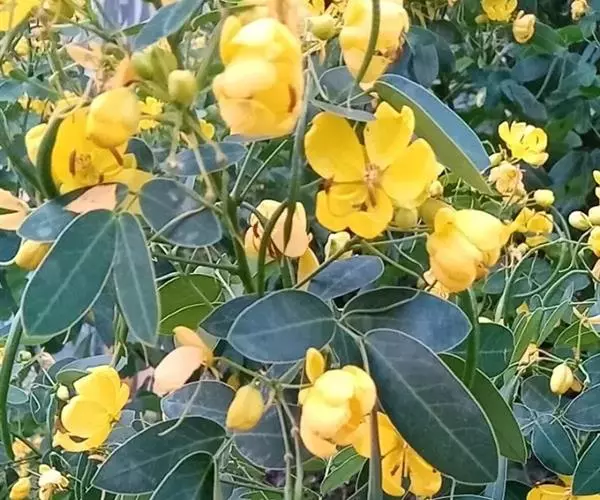双荚决明(Senna bicapsularis(L.) Roxb.),又名双荚槐、金叶黄槐、金边黄槐,豆科(Leguminosae)直立灌木。偶数羽状复叶有小叶3-5对,基部一对小叶间具黑褐色腺体1枚。总状花序顶生,花鲜黄色。荚果圆柱状,内有两排黑褐色种子。花期4-11月,果期9-翌年3月。原产美洲热带地区,现广布于全世界热带地区。广东、广西有栽培。