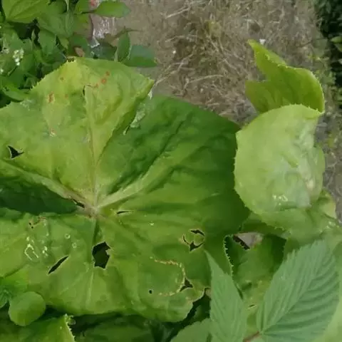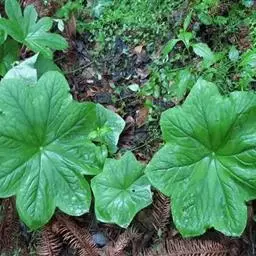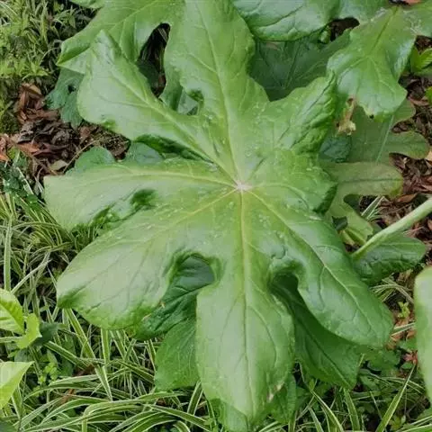 多年生草本,植株高15-30厘米。根状茎细长,通常圆柱形,横走,多须根;茎直立,无毛,有时带紫红色。茎生叶通常2枚,薄纸质,互生,不等大,形状多样,偏心盾状着生,叶片不分裂或浅裂,长5-11厘米,宽7-15厘米,基部常呈圆形,两面无毛,上面有时带紫红色,边缘疏生乳突状细齿;叶柄不等长,约3-11厘米,无毛。