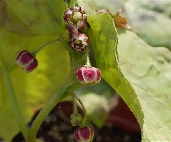 花2-5朵着生于叶基部处,无花序梗,簇生状;花梗长1-2厘米,下弯,疏生白色柔毛;萼片6,长圆状披针形,长2-2.5厘米,宽2-5毫米,先端渐尖,外面被柔毛,内面无毛;花瓣6,淡赭红色,长圆状条带形,长4-5厘米,宽0.8-1厘米,无毛,先端圆钝;雄蕊6,长约2厘米,花丝长约8毫米,花药长约1.2厘米,药隔先端显著延伸;雌蕊长约9毫米,子房坛状,花柱长约2毫米,柱头膨大呈盾状。浆果小,圆球形。花期4-6月,果期6-9月。