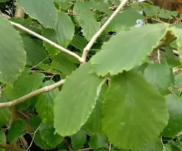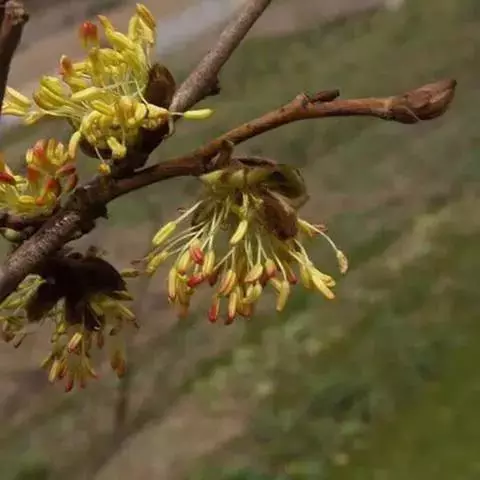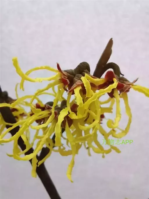 落叶灌木或小乔木,高达8米;嫩枝有星状绒毛;老枝秃净;芽体长卵形,有灰黄色绒 金缕梅 毛。叶纸质或薄革质,阔倒卵圆形,长8-15厘米,宽6-10厘米,先端短急尖,基部不等侧心形,上面稍粗糙,有稀疏星状毛,不发亮,下面密生灰色星状绒毛;侧脉6-8对,最下面1对侧脉有明显的第二次侧脉,在上面很显著,在下面突起;边缘有波状钝齿;叶柄长6-10毫米,被绒毛,托叶早落。