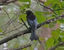 发冠卷尾是中型鸟类,体长28-35厘米。通体绒黑色缀蓝绿色金属光泽,额部具发丝状羽冠,…