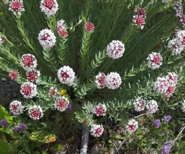 花白色、黄色至带紫色,芳香,多花的头状花序,顶生,圆球形;具绿色叶状总苞片;无花梗;花萼筒细瘦,长9-11毫米,具明显纵脉,基部略膨大,无毛,裂片5,卵状长圆形,长2-4毫米,宽约2毫米,顶端圆形,稀截形,常具紫红色的网状脉纹;雄蕊10,2轮,下轮着生花萼筒的中部以上,上轮着生于花萼筒的喉部,花药微伸出,花丝极短,花药黄色,线状椭圆形,长约1.5毫米;花盘一侧发达,线形,长约1.8毫米,宽约0.2毫米,顶端微2裂;子房椭圆形,几无柄,长约2毫米,直径1.2毫米,上部被淡黄色丝状柔毛,花柱短,柱头头状,顶端微被黄色柔毛。果实圆锥形,长5毫米,直径约2毫米,上部或顶部有灰白色柔毛,为宿存的花萼筒所包围;种皮膜质,淡紫色。花期4-6月,果期7-9月。