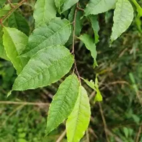 黑樱桃是乔木,高达7米,树皮暗灰色。小枝灰褐色,嫩枝淡褐色,密被长柔毛。冬芽长卵形,鳞片外面伏生短柔毛。叶片倒卵形或倒卵状椭圆形,长3-9厘米,宽1.5-4厘米,先端骤尖或短尾尖,基部楔形或圆形,边有重锯齿,上面绿色,除中脉伏生疏柔毛外,其余无毛,下面淡绿色,除中脉和侧脉上有伏生疏柔毛外,其余无毛,侧脉6-9对;叶柄长0.5-1.5厘米,密生柔毛;托叶线形,边有稀疏深紫色腺体,与叶柄近等长或较短,花后脱落。