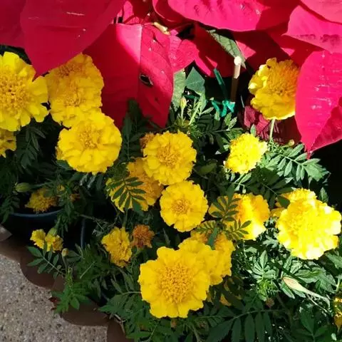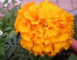 万寿菊是菊科万寿菊属一年生草本植物,别名孔雀菊、缎子花、臭菊花、西番菊、红黄草、小万寿菊、臭芙蓉、孔雀草。万寿菊茎近基部分枝。叶羽状分裂,长5-10厘米,宽4-8厘米,裂片长椭圆形或披针形,具锐齿,上部叶裂片齿端有长细芒,叶缘有少数腺体。头状花序单生,径5-8厘米,花序梗顶端棍棒状。总苞长1.8-2厘米,径1-1.5厘米,杯状,顶端具尖齿。舌状花黄或暗橙黄色,长2.9厘米,舌片倒卵形,长1.4厘米,基部成长爪,先端微弯缺。管状花花冠黄色,长约9毫米,冠檐5齿裂。瘦果线形,被微毛;冠毛有1-2长芒和2-3短而钝鳞片。花期7-9月。万寿菊中国各地均有栽培,在广东和云南南部、东南部已归化,国外原产墨西哥。万寿菊对土壤要求不严,但以肥沃疏松排水良好的土壤为好。耐移栽,种子发芽适温21-24℃,植株生长适合温度为20-29℃。喜温暖和阳光充足的环境,不