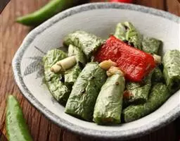 2、熏肉切片;大蒜去皮、切片;红辣椒洗净、去蒂及籽、切丝备用。3、热锅倒入2大匙油烧热,放入做法2以小火爆香,再加入做法1改中小火小心翻炒3分钟,最后加入调味料炒匀即可。