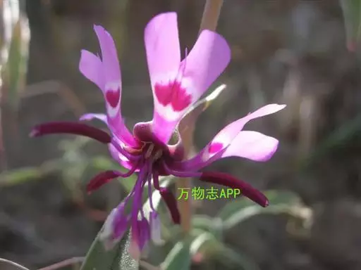 植株全长25-30厘米,茎约1/3埋于地下。鳞茎长5-6厘米,宽1厘米,近基部一侧常有几个扁球形小鳞茎。叶2枚,对生于植株中部以下,椭圆形或宽披针形,长10-11厘米,宽2.5-6.5厘米,先端具短尖头或近急尖,基部楔形,柄长3-4厘米。花单朵顶生,俯垂;花被片披针形,长3.5-5厘米,宽7-11毫米,紫红色,下部有近三齿状的黑色斑纹;花被片内面一基部有4个胼胝体,两侧各有一个近卵状半圆形的耳;花丝钻形,不等长;花药近狭矩圆形,长5-7毫米;花柱向上端稍增粗,具3裂柱头。花期4-5月。