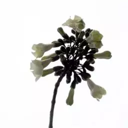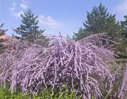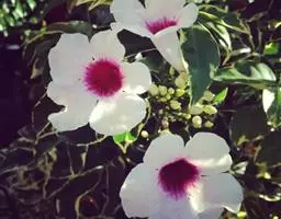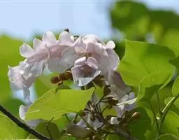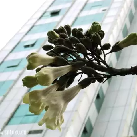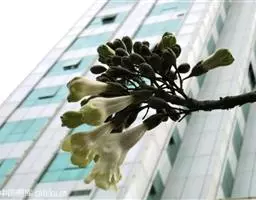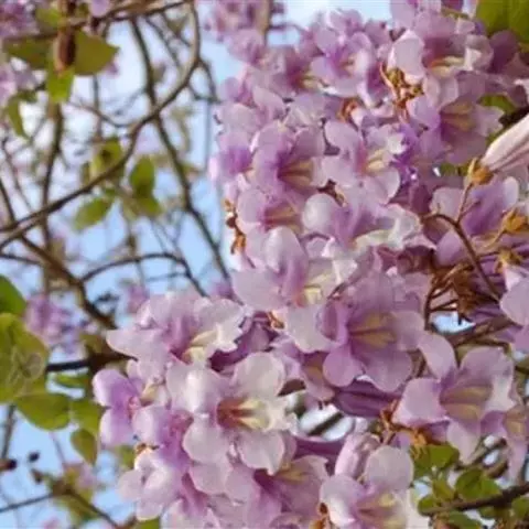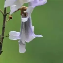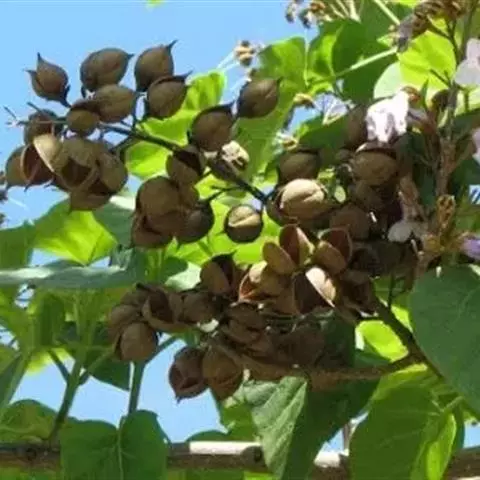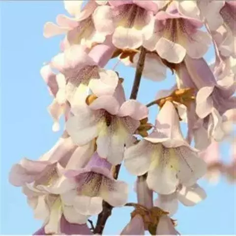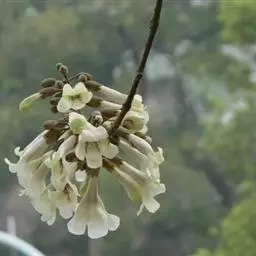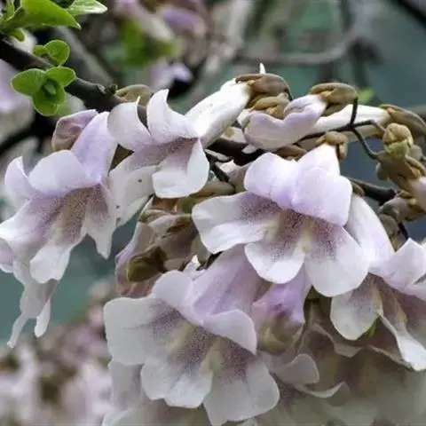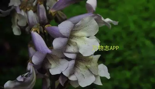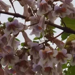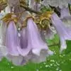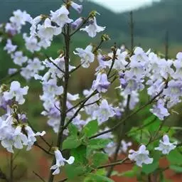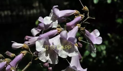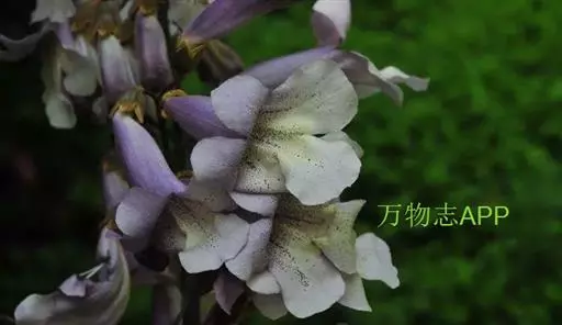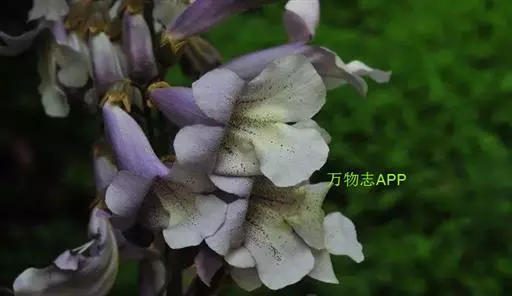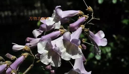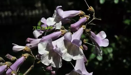 花序枝的侧枝不发达,故花序金字塔形或狭圆锥形,长约30厘米,小聚伞花序的总花梗长8-20毫米,几与花梗等长,有花3-5朵,稀有单花;萼倒圆锥形,长16-20毫米,基部渐狭,分裂至1/3左右成5枚卵状三角形的齿,管部的毛易脱落;花冠漏斗状钟形,紫色至粉白色,长7-9.5厘米,管在基部以上稍弓曲,外面有腺毛和星状毛,内面无毛而有紫色细小斑点,檐部略作2唇形,直径4-5厘米;雄蕊长达25毫米;子房和花柱有腺,花柱长30-35毫米。蒴果卵形,稀卵状椭圆形,长3.5-5厘米,有星状绒毛,宿萼碟状,顶端具长4-5毫米的喙,果皮厚1-2.5毫米;种子连翅长约4-5毫米。花期4-5月,果期秋季。