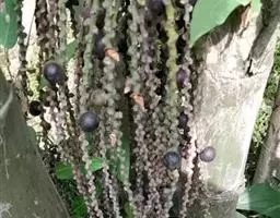 果实略为陀螺形或倒卵形,长约1.5-1.8厘米,直径0.8-1厘米,鲜时土黄色,干时紫黑色,外果皮光滑,中果皮具网状纤维。种子略为倒卵形,胚乳均匀,中央有狭长的空腔,胚侧生。花期5月,果期8月。
