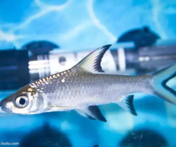 银鲨(学名:Balantiocheilus melanopterus,别名:黑鳍袋唇鱼),硬骨鱼纲,辐鳍鱼亚纲,鲤形目,鲤科鱼。原产地亚洲湄公河与湄南河流域,马来半岛,苏门答腊和婆罗洲的许多流域。其身长可达30余厘米,亚纺锤形。各鳍端均呈尖形,背鳍、腹鳍、臀鳍三角形,尾鳍深叉形。体色银色,腹部泛白,各鳍微泛黄,明显特征是:背鳍、腹鳍、臀鳍和尾鳍外缘均有黑色宽边,黑边内侧为淡灰色宽带,十分醒目。摄食量比较大,生长快,体格健壮,容易饲养,要用大型水族箱,加盖防跳。性情温和活泼,喜欢集群游动。幼鱼时期可和它种鱼混养,长大后单养或者和体格相当的鱼混养。