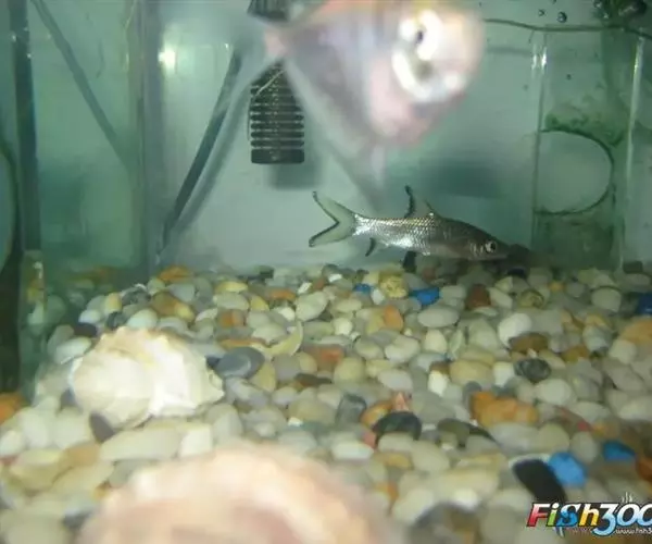 银鲨其身长在自然界中可达30cm—40cm(成鱼野外),亚纺锤形。各鳍端均呈尖形,背鳍、腹鳍、臀鳍三角形,尾鳍深叉形。体色银色,腹部泛白,各鳍微泛黄,明显特征是:背鳍、腹鳍、臀鳍和尾鳍外缘均有黑色宽边,黑边内侧为淡灰色宽带,十分醒目。 雌雄外观不易区别,一般来说成鱼鱼腹部较平,雌性成鱼的腹部稍有弧度。