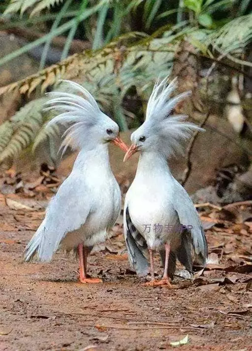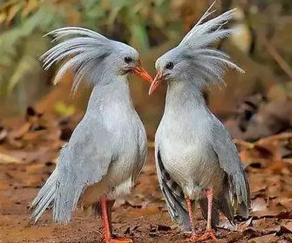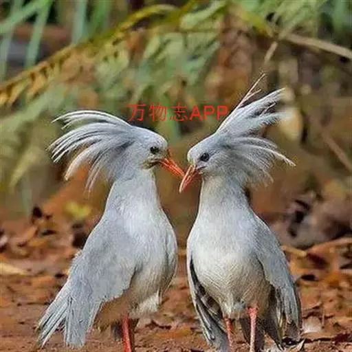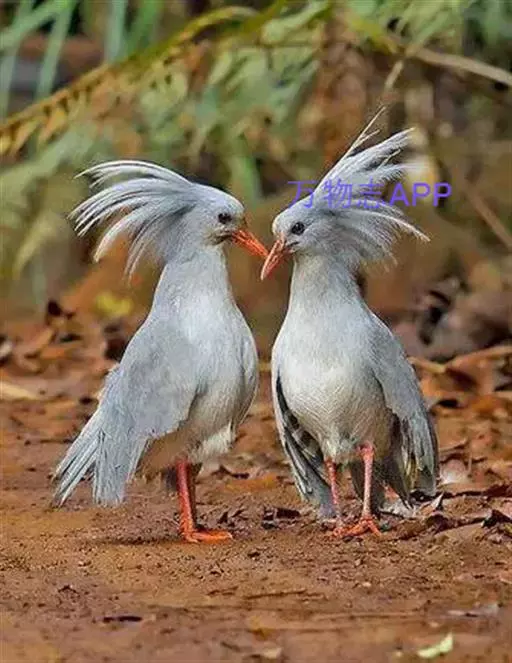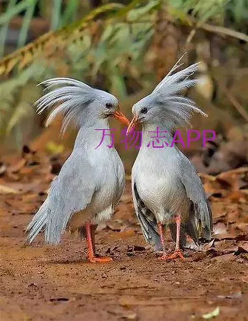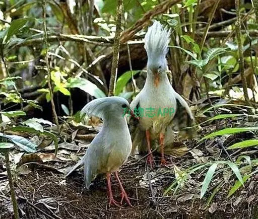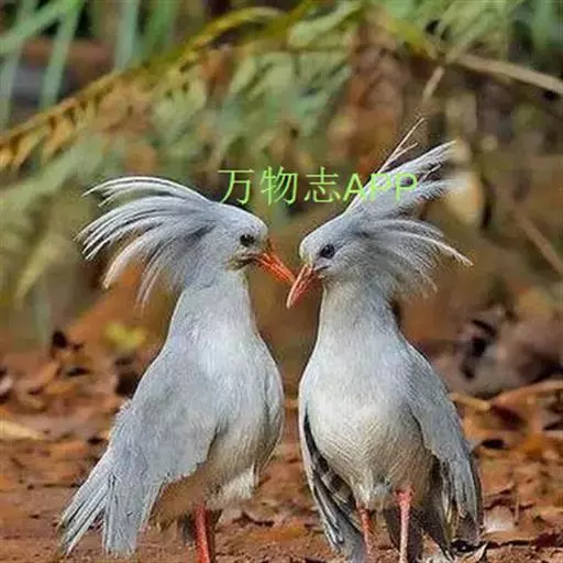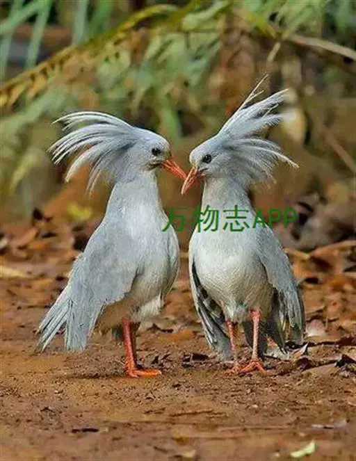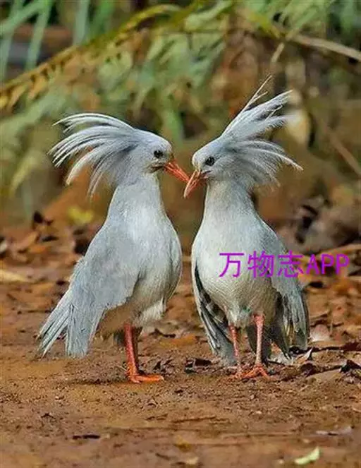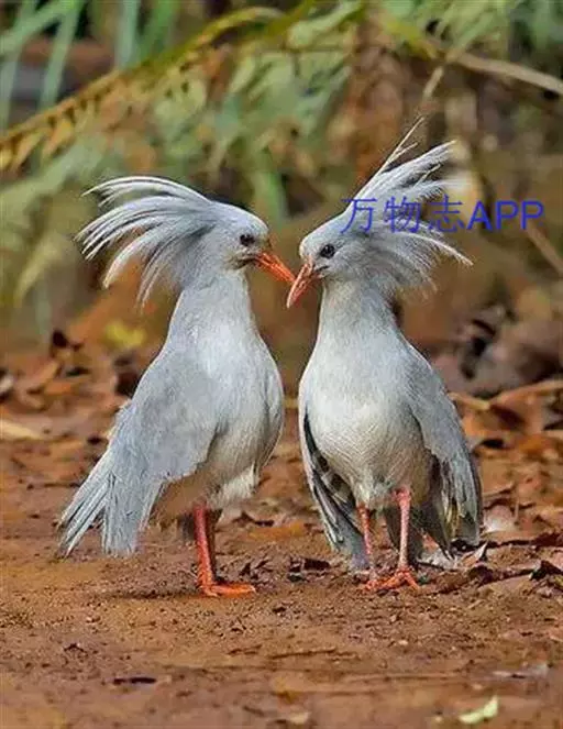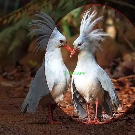 成鸟羽色为明亮的灰白色(森林走禽一般颜色偏暗)。羽冠长而蓬松,炫耀或抖落粉尘时可以竖立。喙、腿桔红色,眼深桔红色。 翅上覆羽和尾部羽色较深,呈灰蓝色。下体大致白色,仅喉和胸部杂有少量浅灰羽毛。翅形大,展开时可见初级飞羽上有明显的黑、白交错斑纹。喙基部有保护鼻孔的胼胝状组织覆盖(该特征任何其他鸟类都不具备),周围散布几缕嘴须。