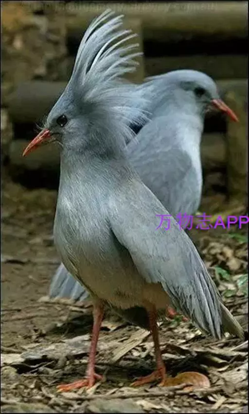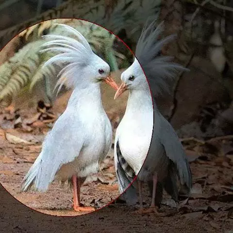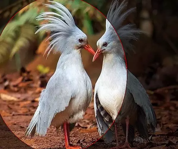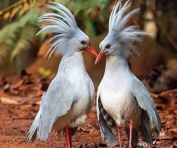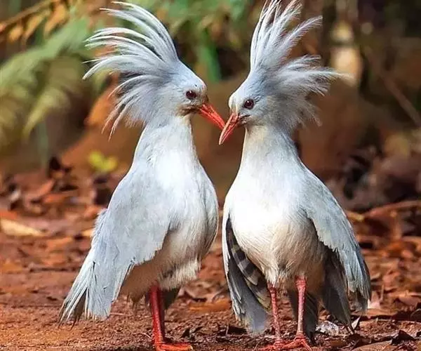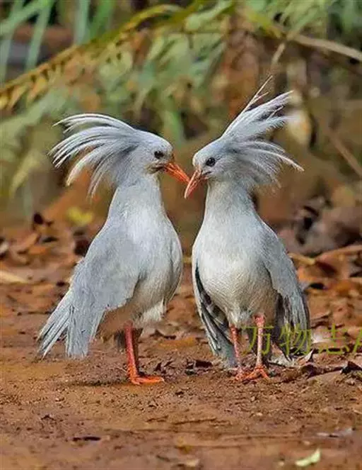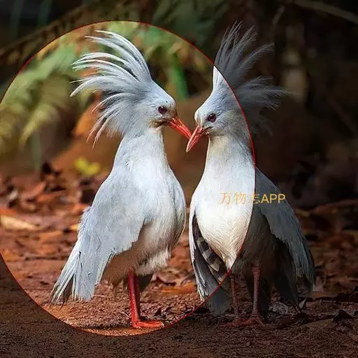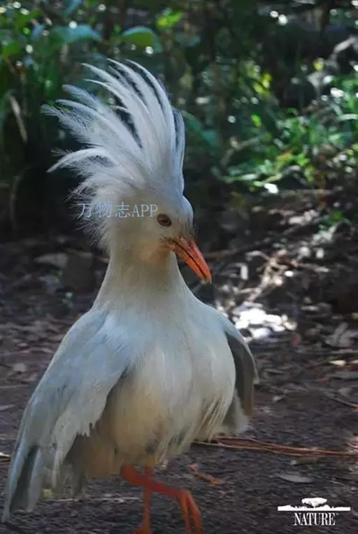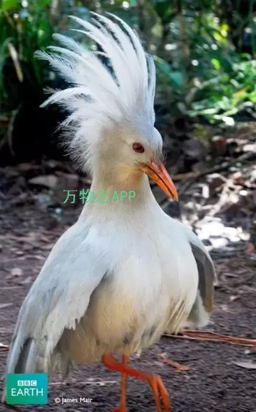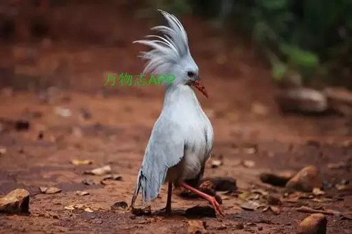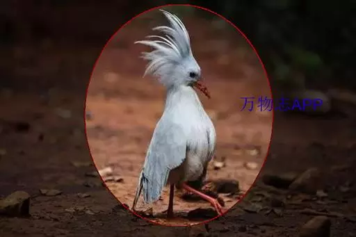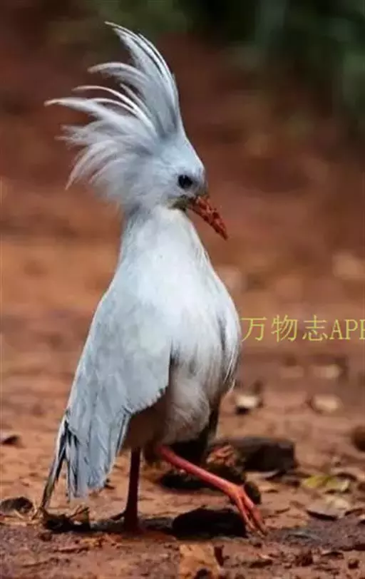 成鸟羽色为明亮的灰白色(森林走禽一般颜色偏暗)。羽冠长而蓬松,炫耀或抖落粉尘时可以竖立。喙、腿桔红色,眼深桔红色。 翅上覆羽和尾部羽色较深,呈灰蓝色。下体大致白色,仅喉和胸部杂有少量浅灰羽毛。翅形大,展开时可见初级飞羽上有明显的黑、白交错斑纹。喙基部有保护鼻孔的胼胝状组织覆盖(该特征任何其他鸟类都不具备),周围散布几缕嘴须。