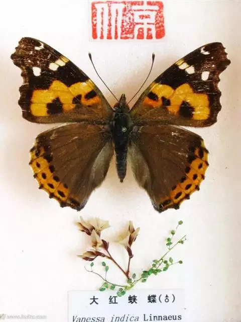 大红蛱蝶Vanessa indica Herbst,翅黑褐色,外缘波状。前翅M1脉外伸成角状,…