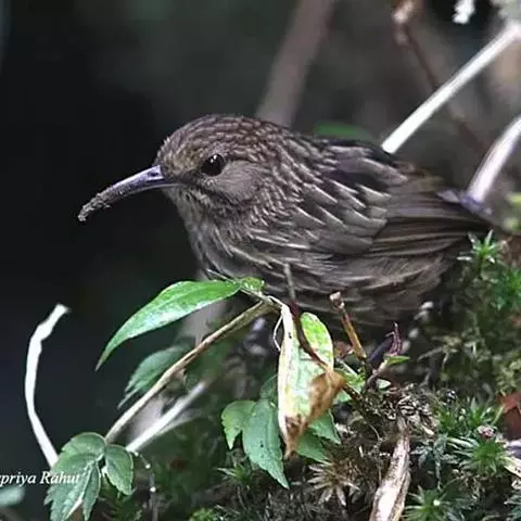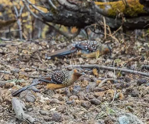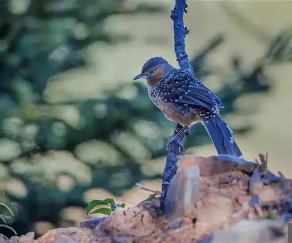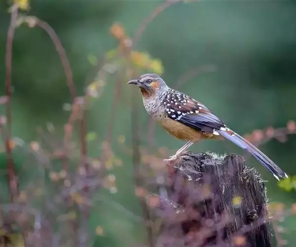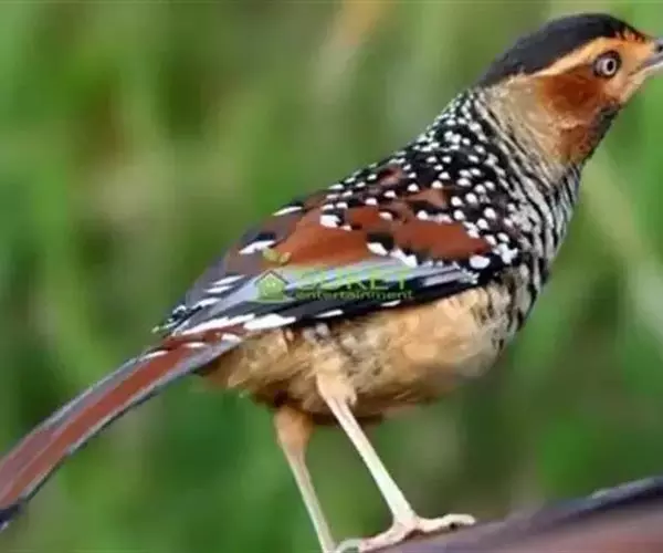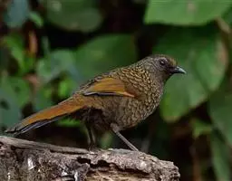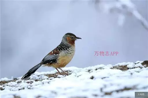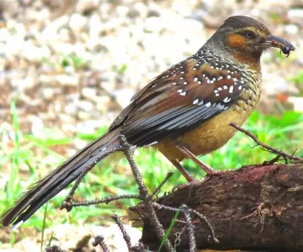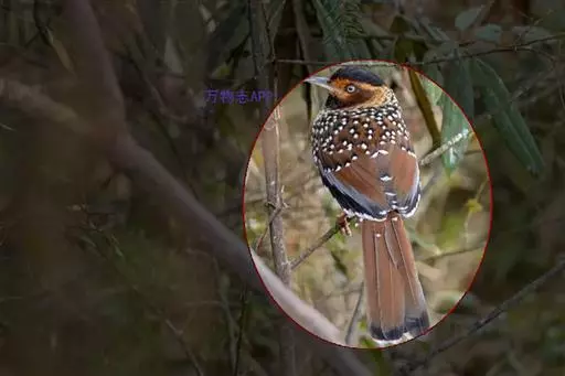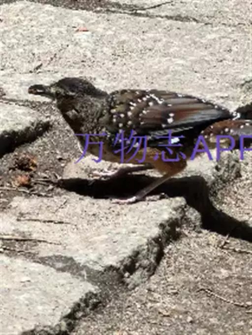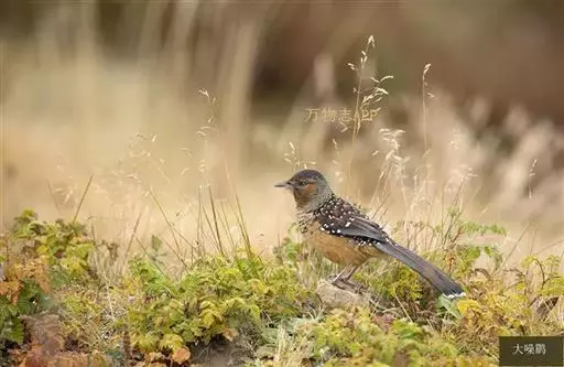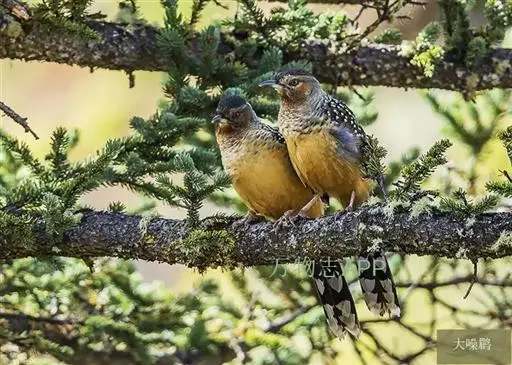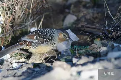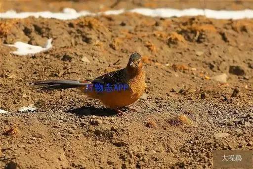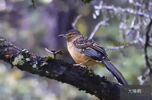 大噪鹛(学名:Garrulax maximus):中型鸟类,体长32-36厘米。额至头顶黑褐色,背栗褐色满杂以白色斑点,斑点前缘或四周还围有黑色。初级覆羽、大覆羽和初级飞羽具白色端斑。尾特长,均具黑色亚端斑和白色端斑。颏、喉棕褐色,喉具棕白色端斑和窄的黑色亚端斑,其余下体棕褐色。野外特征极明显,容易识别。相似种眼纹噪鹛体型较小,尾亦较短,喉和颈侧黑色,胸具黑白相间横斑。区别较明显,野外不难鉴别。
