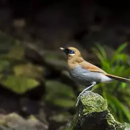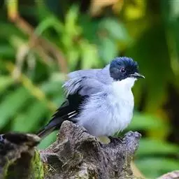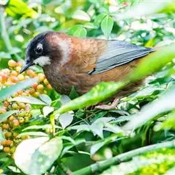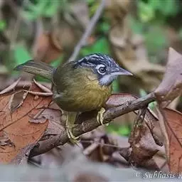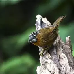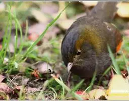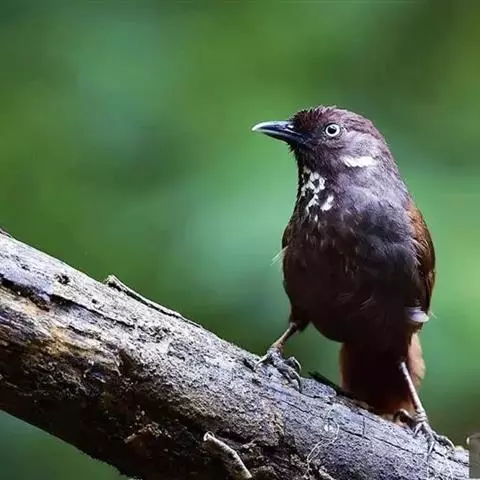 黑顶噪鹛:中型鸟类,体长24-26厘米。前额、脸、颏、喉黑色,头顶黑褐沾棕或深棕橄榄褐色,…